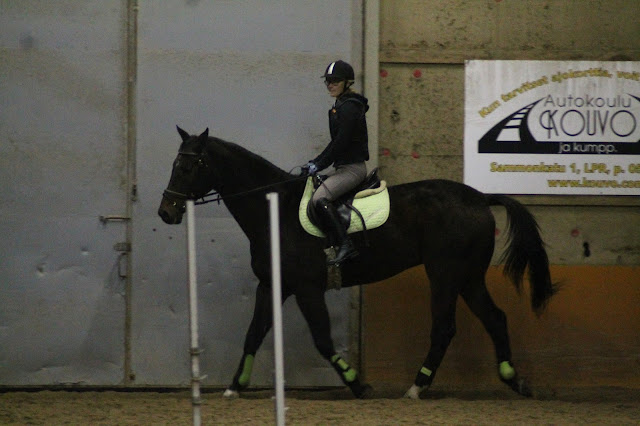 Alkuverkaksi tehtiin ensin avotaivutusta ravissa, meni ihan hyvin mutta Lamoca yritti korvata työn teon vauhdilla. Lamoca sai mennä avotaivutuksissa vähän pidemmällä kaulalla, mutta ei niin paljon kuin yleensä. Sitten alettiin avojen lisäksi tulemaan ravissa puomi pääty ympyrällä. Tultiin pari kertaa ravissa molempiin suuntiin, sitten laukassa. Sain säädeltyä laukka askeleen pituutta paljon paremmin kuin edellisellä katastrofi puomi tunnilla, ja saatiin nyt askel osumaan lähes aina.